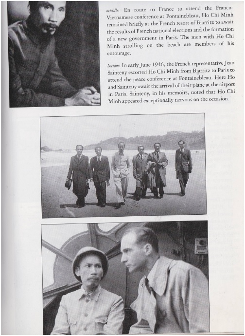 Hình dưới: Vào những ngày đầu tháng 6, 1946, đại diện nước Pháp, ông Jean Sainteny, hộ tống Hồ Chí Minh từ Biarritz đến Paris để dự hội nghị hòa bình tại Fontainebleau. Tại đây Hồ và Sainteny chờ máy bay đến tại phi trường ở Paris. Sainteny, trong hồi ký của ông ta, ghi rằng Hồ Chí Minh tỏ ra lo sợ một cách khủng khiếp về vấn đề đang xảy ra (occasion: cuộc bầu cử diễn ra mà Đảng Cộng Sản Pháp đã mất ghế).