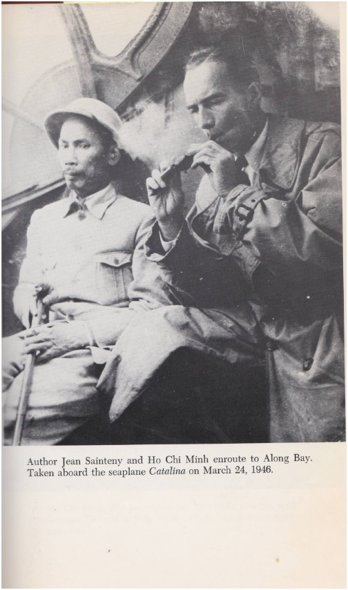 Tác giả Jean Sainteny và Hồ Chí Minh trên đường đến Vịnh Hạ Long. Lên tàu Catalina ngày 24/3/1946. (Ho Chi Minh and His Vietnam, translated by Herma Briffault, 1972, Henry Regnery Company, Chicago, Illinois, page 66)