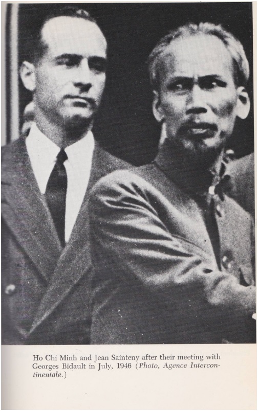 Hồ Chí Minh và Jean Sainteny sau buổi họp với Georges Bidault (thủ tướng của chính phủ mới đắc cử) vào tháng 7, 1946. (Ho Chi Minh and His Vietnam, Jean Sainteny, 1972, page 66)