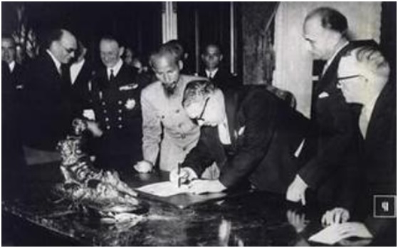 "Chủ tịch Hồ Chí Minh và Bộ trưởng Hải ngoại Pháp Marius Moutet ký bản tạm ước Việt – Pháp ngày 14-9-1946