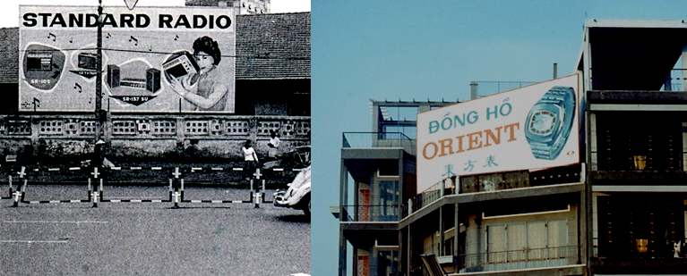 Nói đến hàng hóa tiêu dùng dân dụng th́ tại thời điểm ấy thị trường Sài G̣n miền Nam hàng hóa trù phú chất lượng cao, c̣n nhiều hơn Trung Quốc, tấp nập bày bán tự do. Tại miền Bắc, Hà Nội chẳng có bất cứ một thứ ǵ để mà so sánh, bởi v́ người dân b́nh thường Sài G̣n thời điểm ấy đang sử dụng quạt máy, tủ lạnh, máy may và TV đen trắng. Trong khi hai mặt hàng mà bất cứ người dân miền Bắc nào cũng mơ ước (như nhà văn Dương Thu Hương nói) là đồng hồ đeo tay và Radio th́ thừa mứa ở các quầy hàng khắp miền Nam đến nỗi các hảng sản xuất phải treo bảng quảng cáo trên đường (trong ảnh). Nói cho vui, miền Bắc dưới sự lănh đạo của đảng chỉ có hai thứ mà miền Nam không có là (tên lửa Sam 2 và phân người hoại mục).
