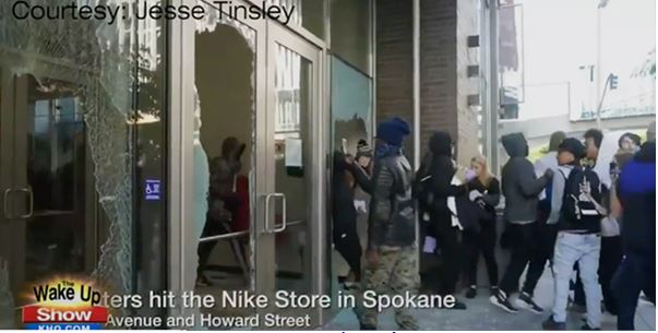Cửa hàng Nike bán giày và áo quần thể thao (downtown Spokane – June.1.2020) bị đập bể cửa. Người biểu t́nh đua nhau lấy các món hàng trong cửa tiệm.