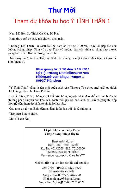 Ngày giờ và địa điểm cuộc biểu t́nh: Thứ bảy 17.09.2011 biểu t́nh mở đầu tại Odeonsplatz (13 ─ 14 giờ) sau đó tuần hành từ Odeonsplatz đến Marienplatz (14 ─ 14:45 giờ) biểu t́nh kết thúc tại Marienplatz (14:45 ─ 16 giờ) Phương thức tổ chức: Xin quư thân hữu và đồng hương vui ḷng