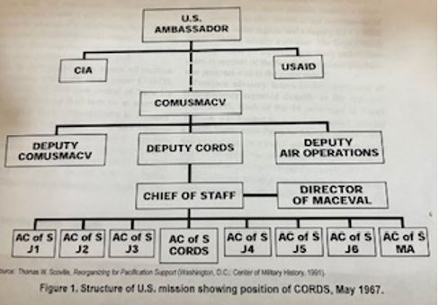 Dưới 2 vị Phụ tá, có các ban, ngành dân sự, đưa vào tổ chức theo một hệ thống quân giai, kể cả một Phụ tá giữ vai tṛ ‘Tham mưu trưởng cho CORDS, cũng được xếp theo hệ thống quân giai. Đây là lần đầu tiên các nhân viên dân sự làm việc theo một hệ thống chỉ huy kiểu quân sư, chia thành các ban, tiểu ban như một Đại đơn vị quân đội. Tuy là nhân viên dân sự, nhưng vẫn có quyền điều hành các quân nhân và sử dụng các phương tiện quân sự khi cần thiết..