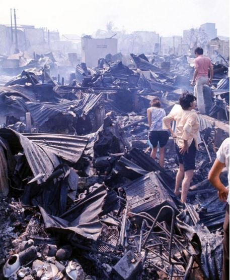 (Sài G̣n sau trận pháo kích của VC lúc 4:30AM ngày 21-4-1975. Khu Mả Lạng. Ảnh: Michel Laurent)