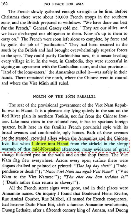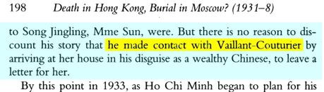 Nhưng người Pháp đă không tin vào những báo cáo này. Ṭa Lănh-sự của họ tại Hồng-Kông tiếp-tục thông-báo cho những giới-chức thẩm-quyền tại Hà-Nội mỗi giai-đoạn trong những nỗ-lực của Hồ nhằm rời khỏi cái thuộc-địa của Anh”. (Trang 194, ḍng 36-39)
