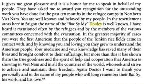 Nguyên văn lời tưởng lệ Thủ tướng Diệm đọc tại pḥng họp Nội các trước Bs Tom Dooley và quan khách (May 12, 1955 – Sau này Đại tá E. Landale cho Dooley hay nguyên văn bản tưởng lệ do chính Landale đánh trên bàn máy của ḿnh. Nguồn: Dr. America: The Lives of Thomas A. Dooley, 1927-1961, (trang 60), James T. Fisher