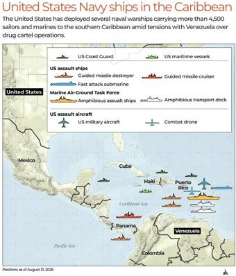 Tháng 8-2025, Hoa Kỳ đă bắt đầu tập trung lực lượng quân sự trong khu vực phía Nam vùng biển Caribbean, dàn chiến hạm và các nhân viên quân sự.