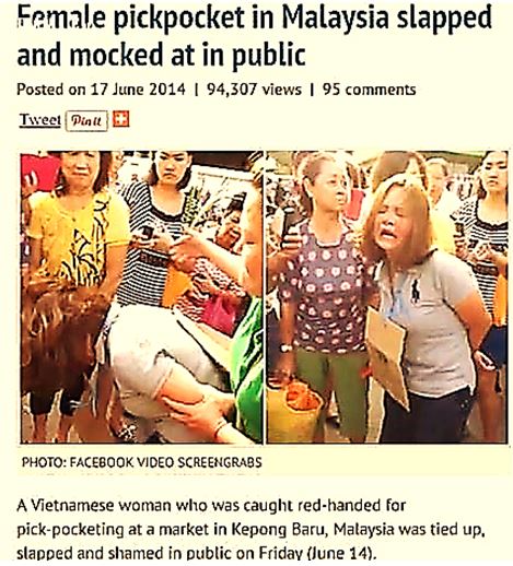 Ngày 13-6-2014, tại khu chợ Kepong Baru, Kuala Lumpur, Malaysia, một phụ nữ Việt Nam móc túi, bị trói tay, tát vào mặt và chửi bới làm nhục. Một người đứng phía sau nắm tóc giật mạnh cho thấy rơ mặt, để đám đông chụp h́nh và quay clip, thậm chí c̣n bắt phải mang tờ giấy, nội dung là “Nữ quái móc túi”.